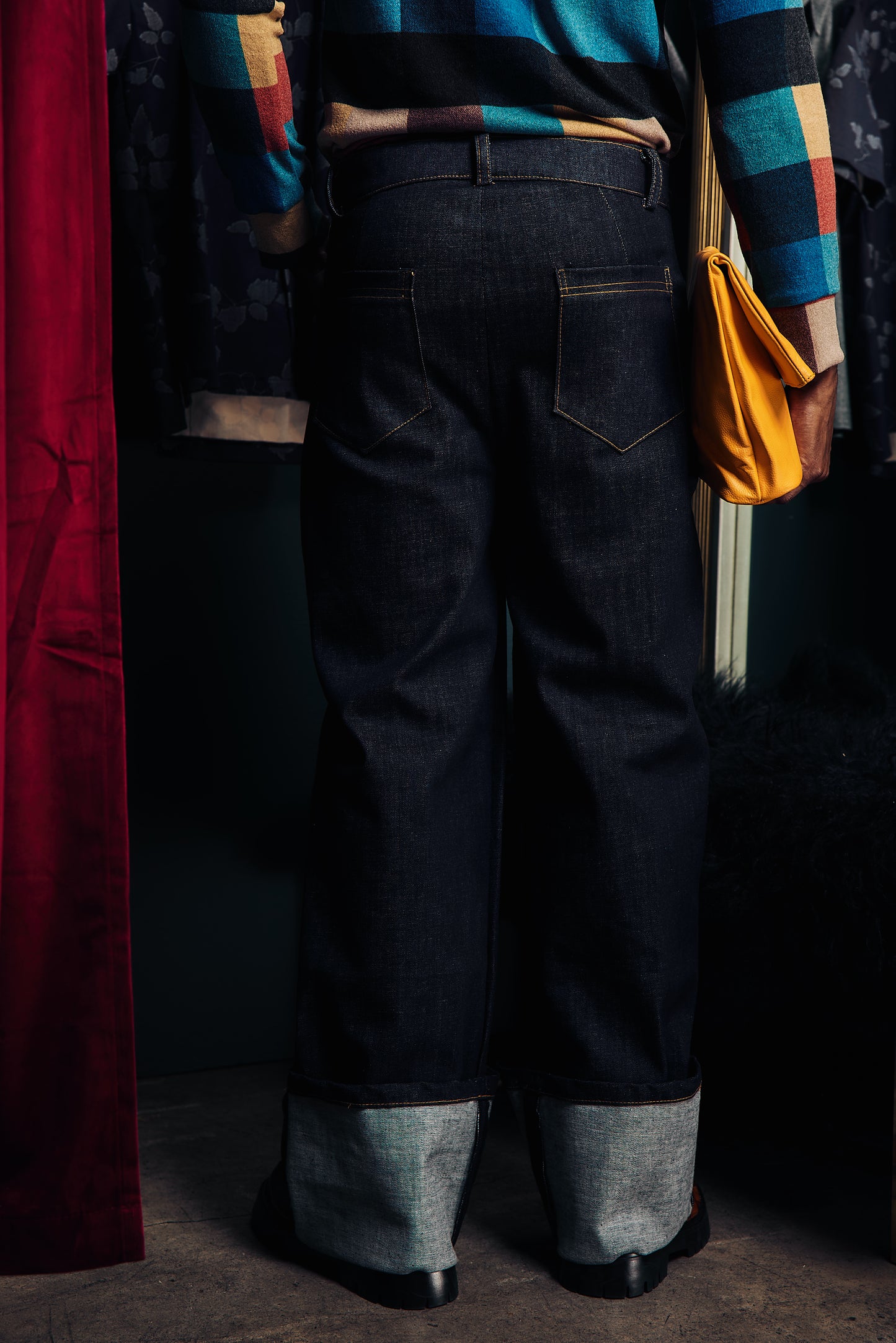 Expertly crafted with a dark denim blue, these wide cuff jeans offer a semi-high waist and semi-wide leg for a comfortable and stylish fit. The perfect combination of form and function, elevate your wardrobe with these versatile and on-trend jeans.