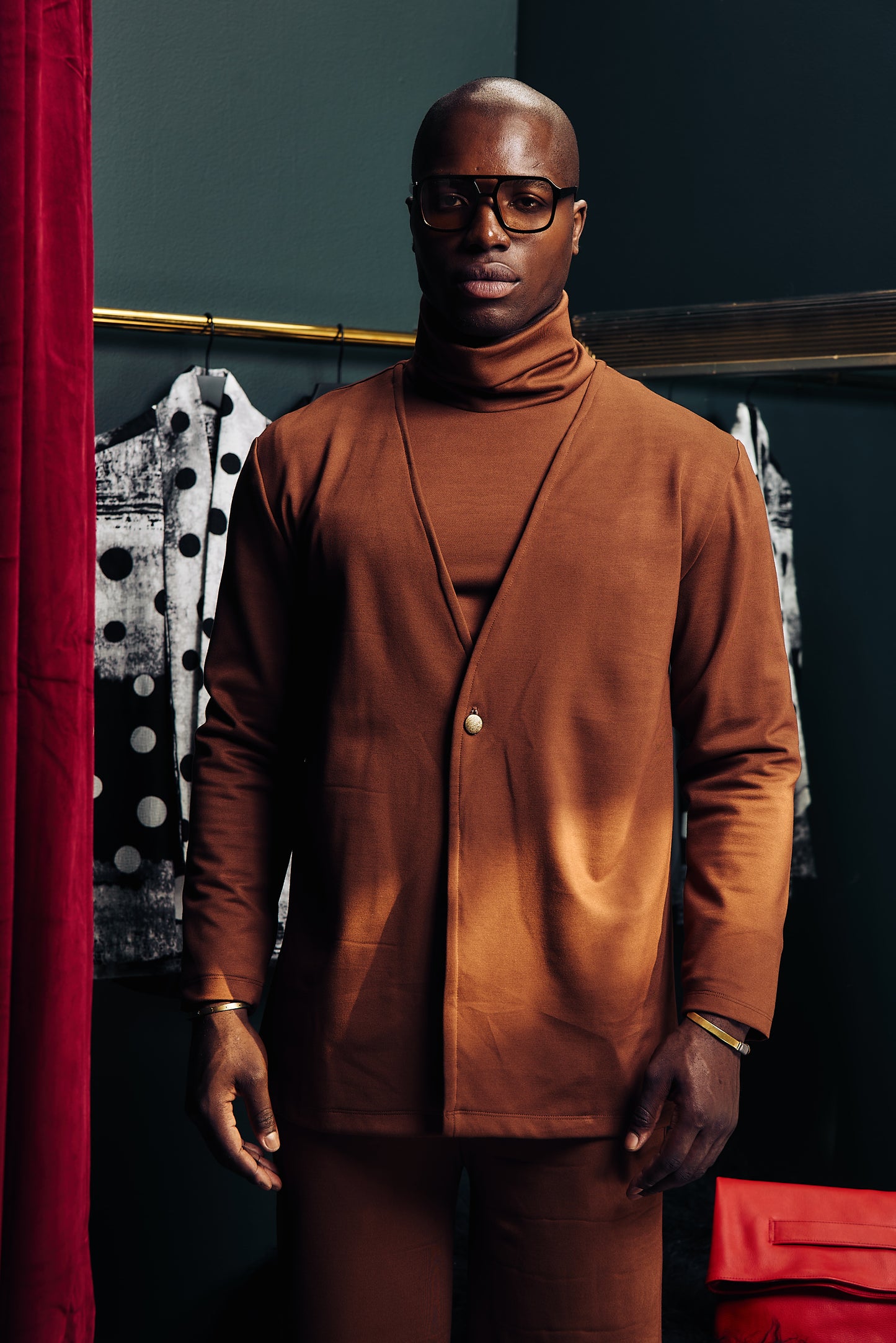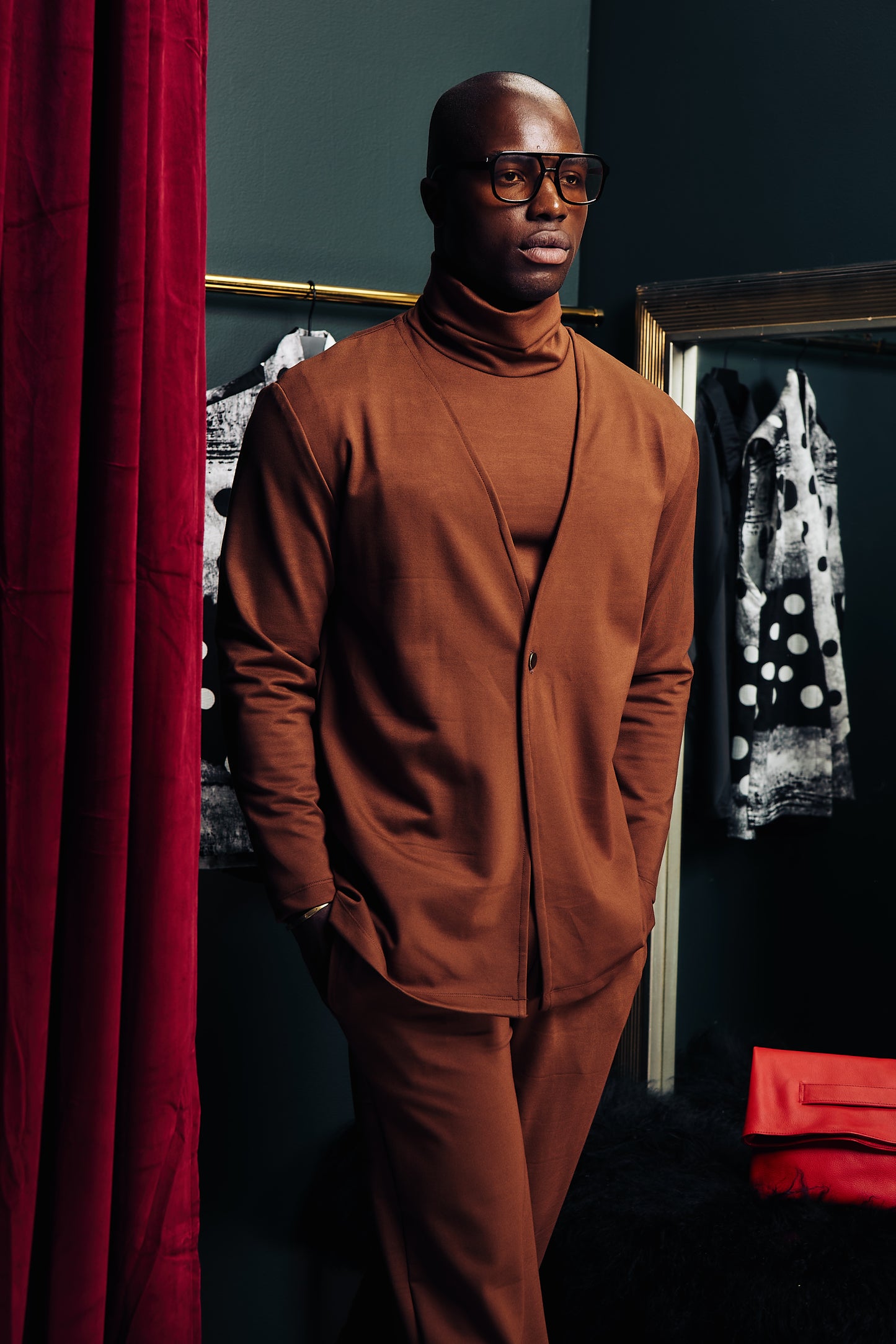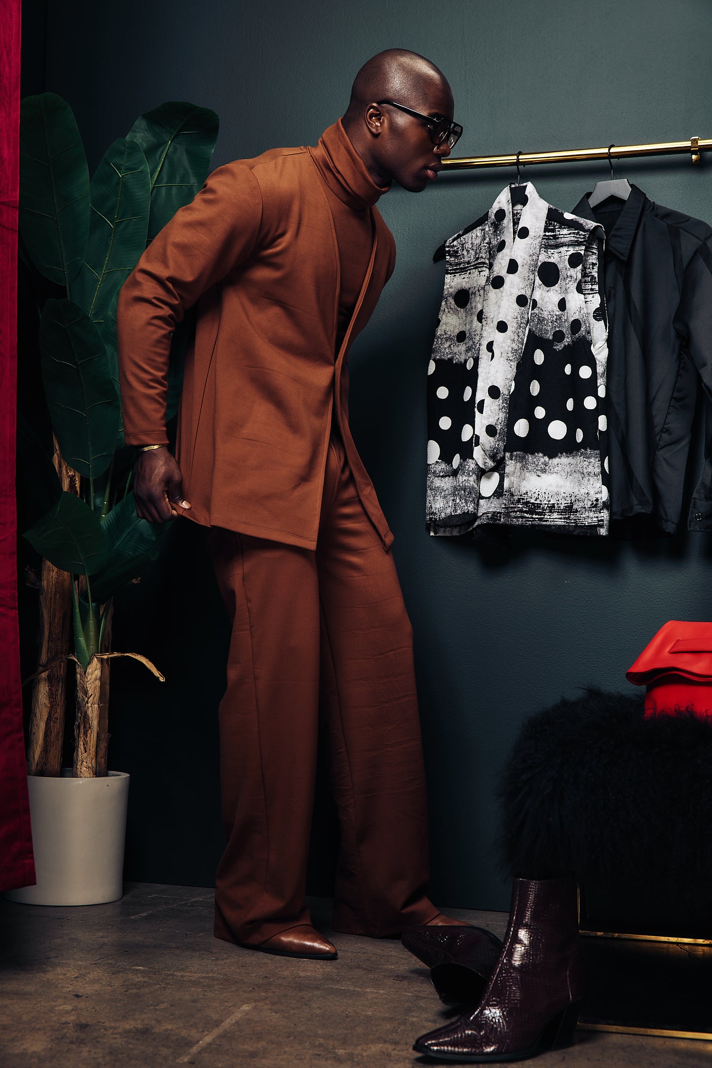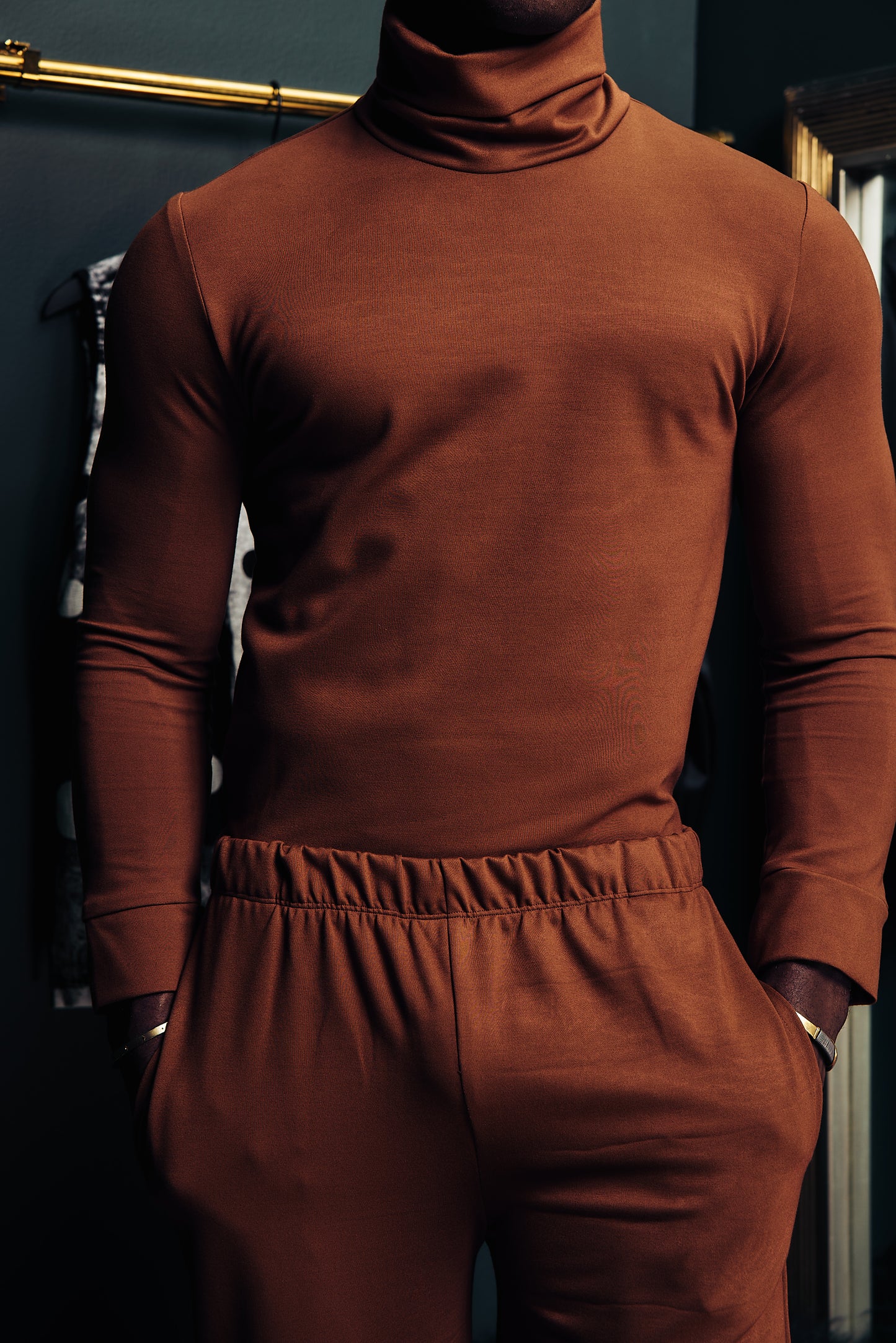 Stay chic and comfortable in our Adeji 3pc pant suit. The Belgian Rust color adds a touch of elegance to the outfit, while the Belgian knit provides a stretchy and structured fit. Mix and match with other pieces for a versatile and stylish look. Includes straight leg pants, fitted turtleneck, and single-button blazer.