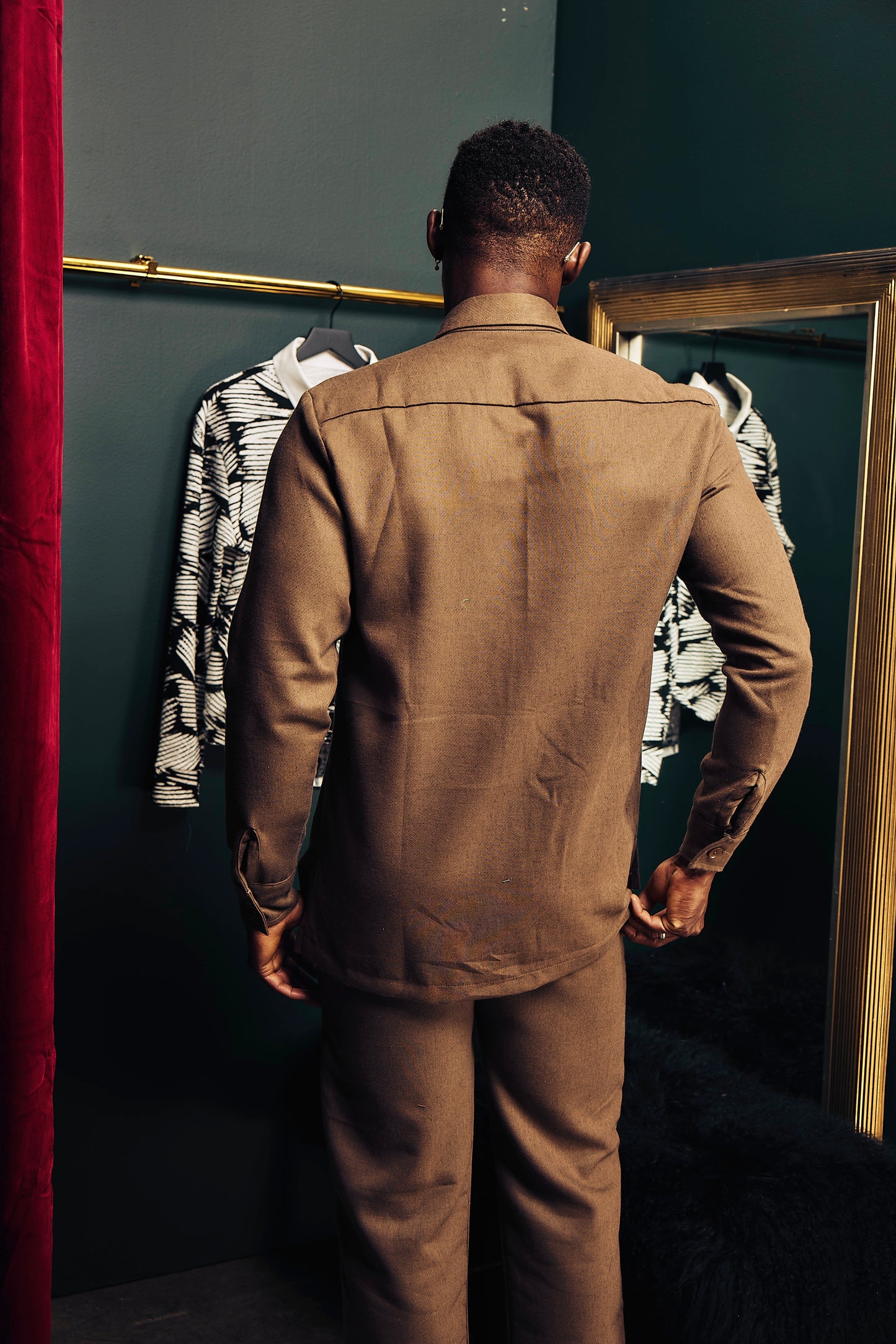 The Ikoyi Pant Suit draws inspiration from Nigerian sartorial excellence, showcasing masterful tailoring in every detail. This two-piece ensemble features a sumptuous Belgian wool blend in warm light brown, renowned for its exceptional softness and drape. The relaxed-fit button-down shirt showcases signature overflap chest detailing—a hallmark of expert craftsmanship—while long sleeves and straight-leg trousers create a refined silhouette. Balancing structure with comfort, this suit embodies the precision and sophistication of West African tailoring traditions, making it a distinguished choice for the discerning wearer.